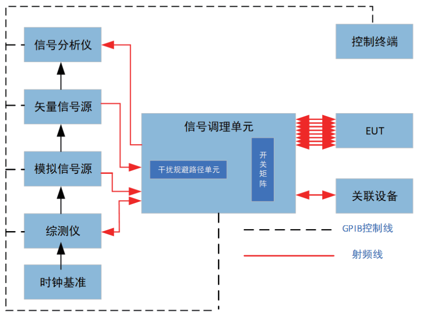 4.矢量信号源和模拟信号源用于向待测设备注入干扰信号。