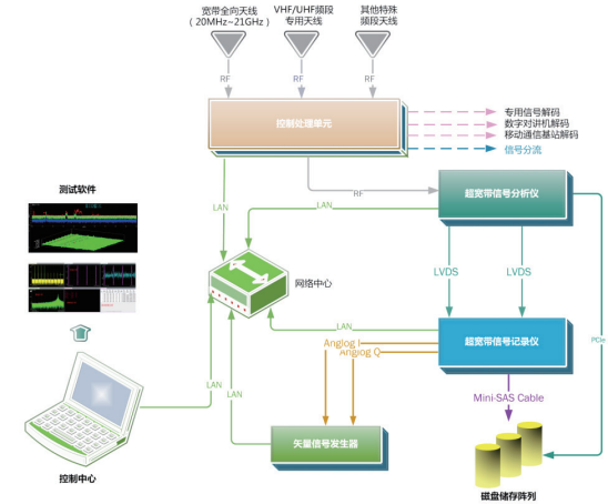 a.超宽带信号分析仪:实现全频段信号监测、指定带宽内信号采集和转换(转换为数字IQ以供信号记录回放设备进行存储)、实时频谱分析、脉冲信号、模拟调制信号和数字调制信号分析;