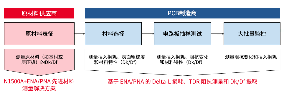 从上面的方案中可以看到Keysight 为PCB原材料供应商、PCB层压材料供应商、PCB制造商和系统制造商提供各种解决方案,包括传输线仿真、阻抗测量、Delta-L 损耗测试以及 Dk/Df 参数提取,其中Dk = 介电常数,Df = 损耗因子。