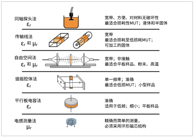 基于材料的多样性和复杂性,需要多种不同的测量方法来实现测试,在测试中,要配合适宜的治具和夹具,如同轴探针、平行板、同轴/波导传输线、自由空间和谐振腔等,才能达成精确和高效的测试。
