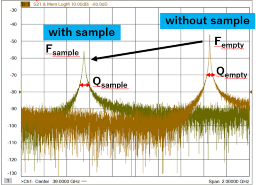 原理上,介电常数ε′由频率偏移Δf/f0计算,损耗角正切tanδ由Q值的变化(1/Q)得到。当使用金属箔时,Q值降低也可以用来评估表面导电率,从而反映毫米波频率下的趋肤效应。