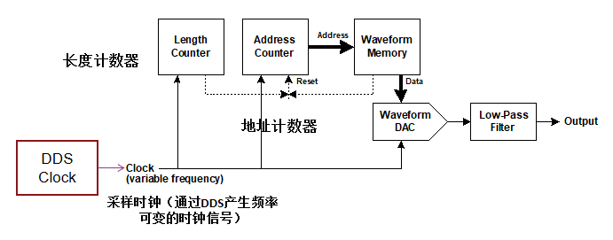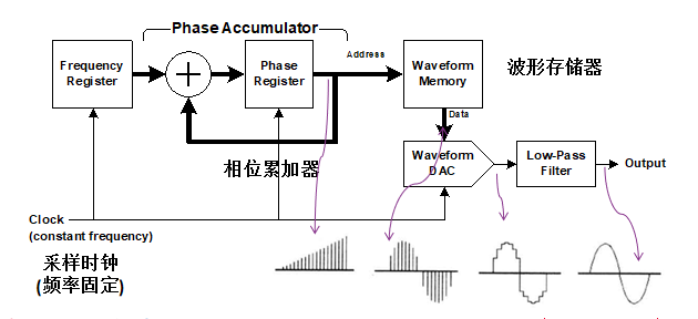 直接数字合成是采用数字化技术,通过控制相位的变化速度,直接产生各种不同频率信号的一种频率合成方法。DDS技术基本结构如下图所示,它主要由相位累加器、波形存储器、D/A转换器和低通滤波器构成。