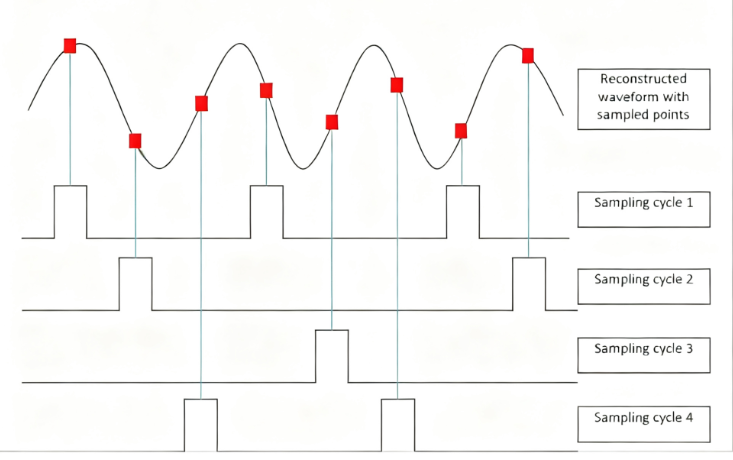为了捕获波形,采样示波器需要一个重复的码型,因为采集需要多次循环。源自时钟信号的码型触发器提供一个触发点,在此触发点之后进行采样。每次码型触发器都会在距离码型触发器稍远的采样点处进行新的采样,并进行迭代。然后,采样示波器使用采集到的样本重建波形