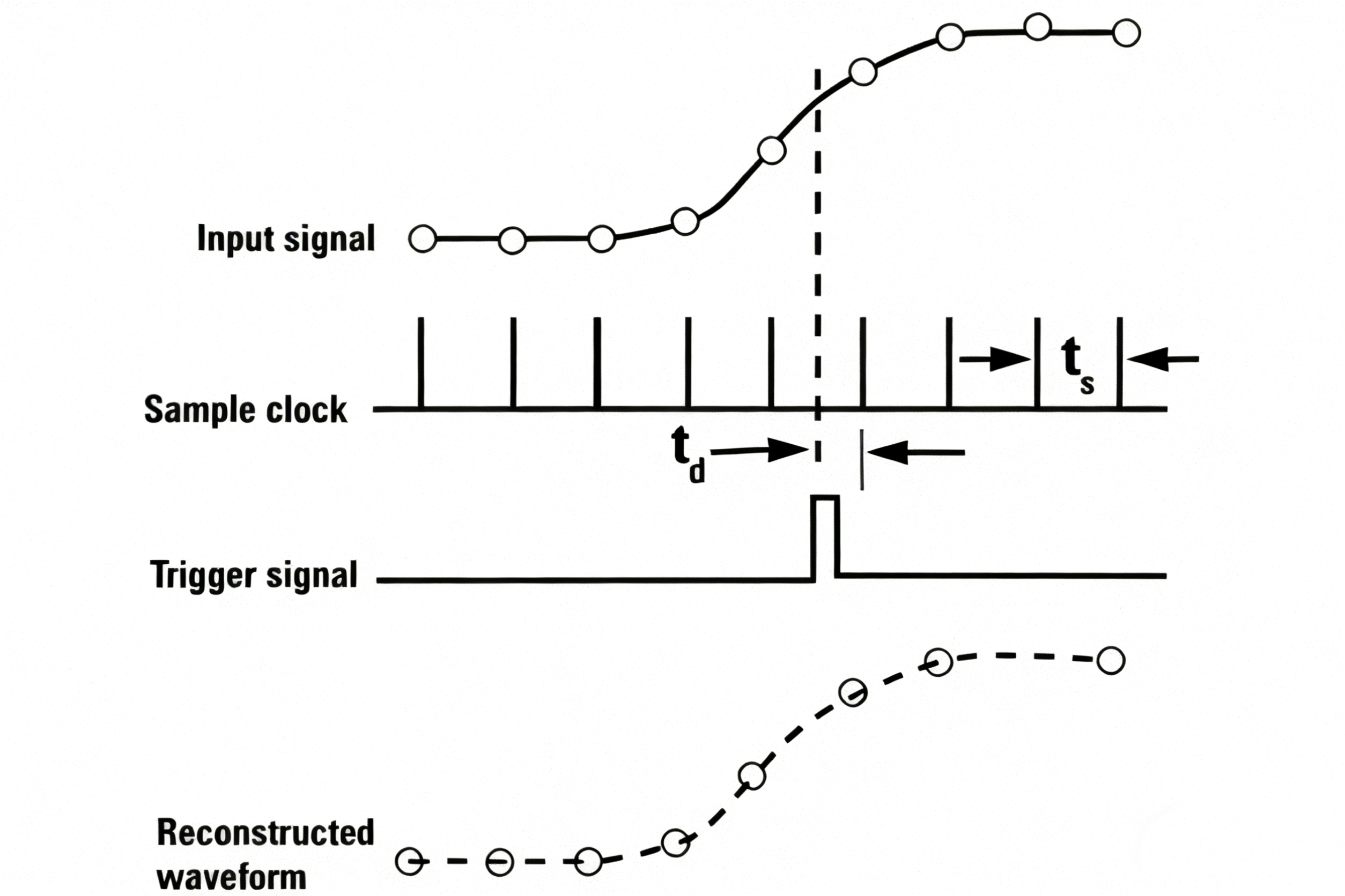 实时示波器使用独立于信号且速度更快的内部采样时钟,并存储触发信号前后采样的数据。