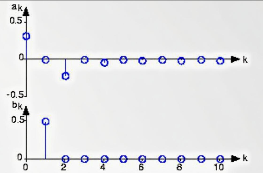 周期信号(例如半波整流正弦波)由一系列基本正弦波组成。傅里叶系数随频率指数变化的函数图(如图所示)显示了信号的频谱。