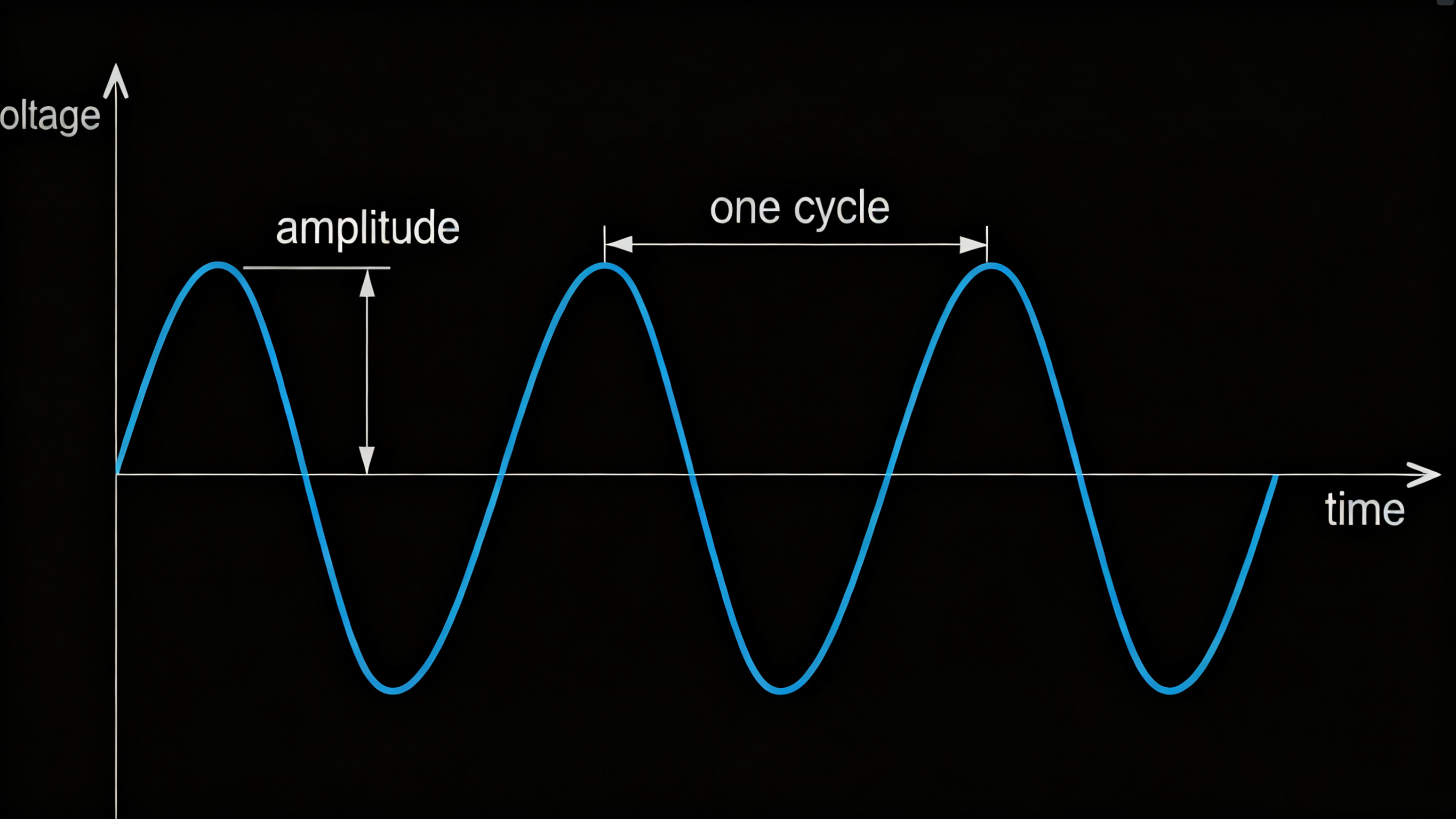 通信的基础是被称为正弦波的模拟信号,如图所示。正弦波之所以重要,不仅因为它们在各种情况下都能自然出现,还因为它们的数学运算简单。下图显示的是一个正弦变化的电压,但其他属性,例如电流、功率、压力等等,也可以以这种方式变化。